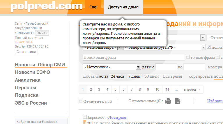 Доступ из дома? Читатель сам получает его, чтобы иметь «личные списки», «личный кабинет», т.е. закладки остаются при смене пользовательского устройства. Кнопка Доступ из дома в «шапке» polpred появляется, если библиотека авторизовалась на polpred. Отправив нам краткую анкету читатель получает письмо с личным логином доступа.