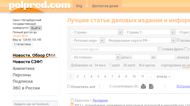 Читатель библиотеки (имеющей разрешенный доступ на polpred) сразу попадает на эту базу данных в рубрикатор. Из других разделов перейти в него можно через «Новости. Обзор СМИ» меню слева.