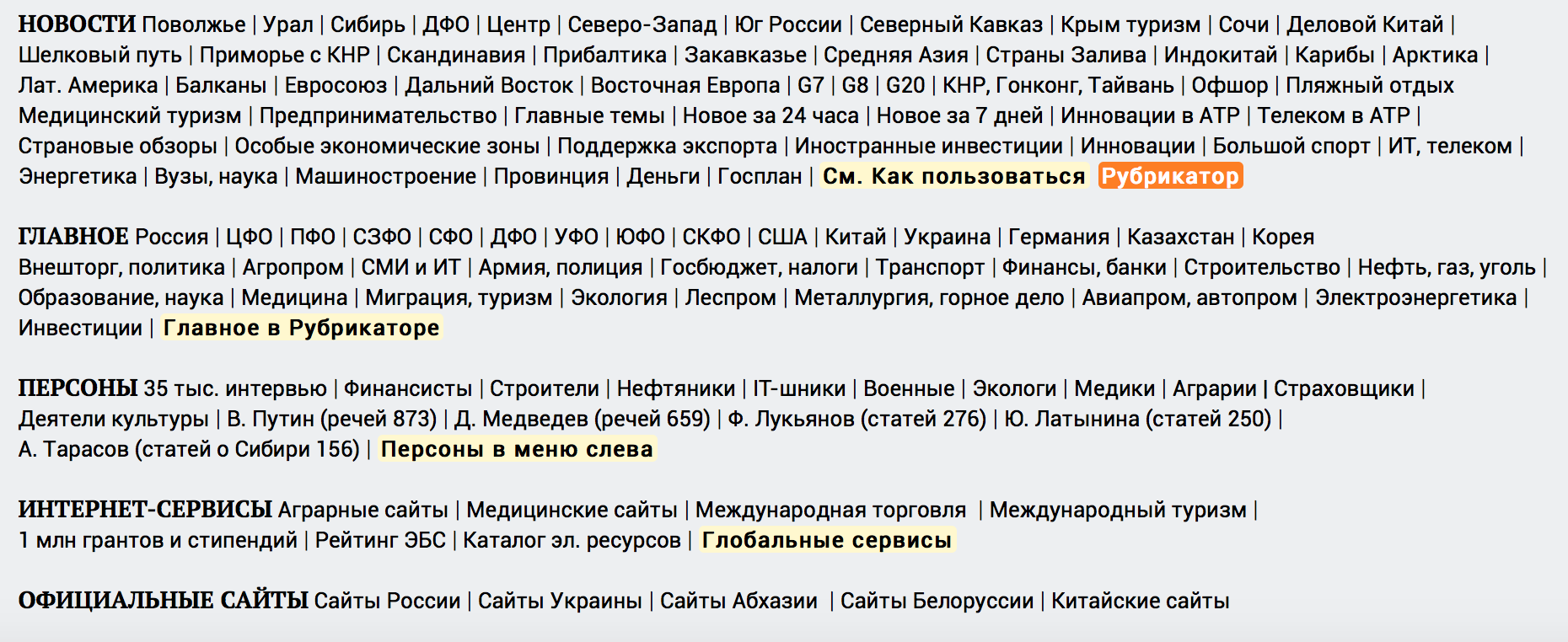 Повторяется на каждой странице портала. Меню видоизменяется, подсказывая точки интереса, по мере работы читателя с рубрикатором поиска. Меню реагирует, из какой страны или федерального округа РФ приходит читатель, предлагается соответствующий блок новостей.