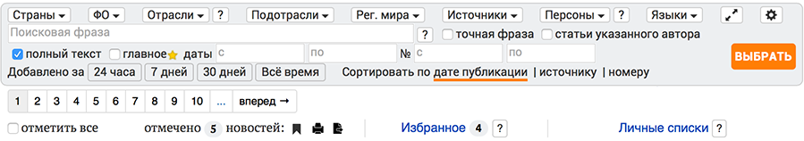 Рубрикатор с настройками для работы с массивом полнотекстовых деловых статей. В отдельных полях: поисковая строка / отрасль / источник / дата / страна / фед. округ РФ / регион мира / главное / персоны / личные списки / отметить / избранное. Для подробного изучения рубрикатора пройдите Тур.