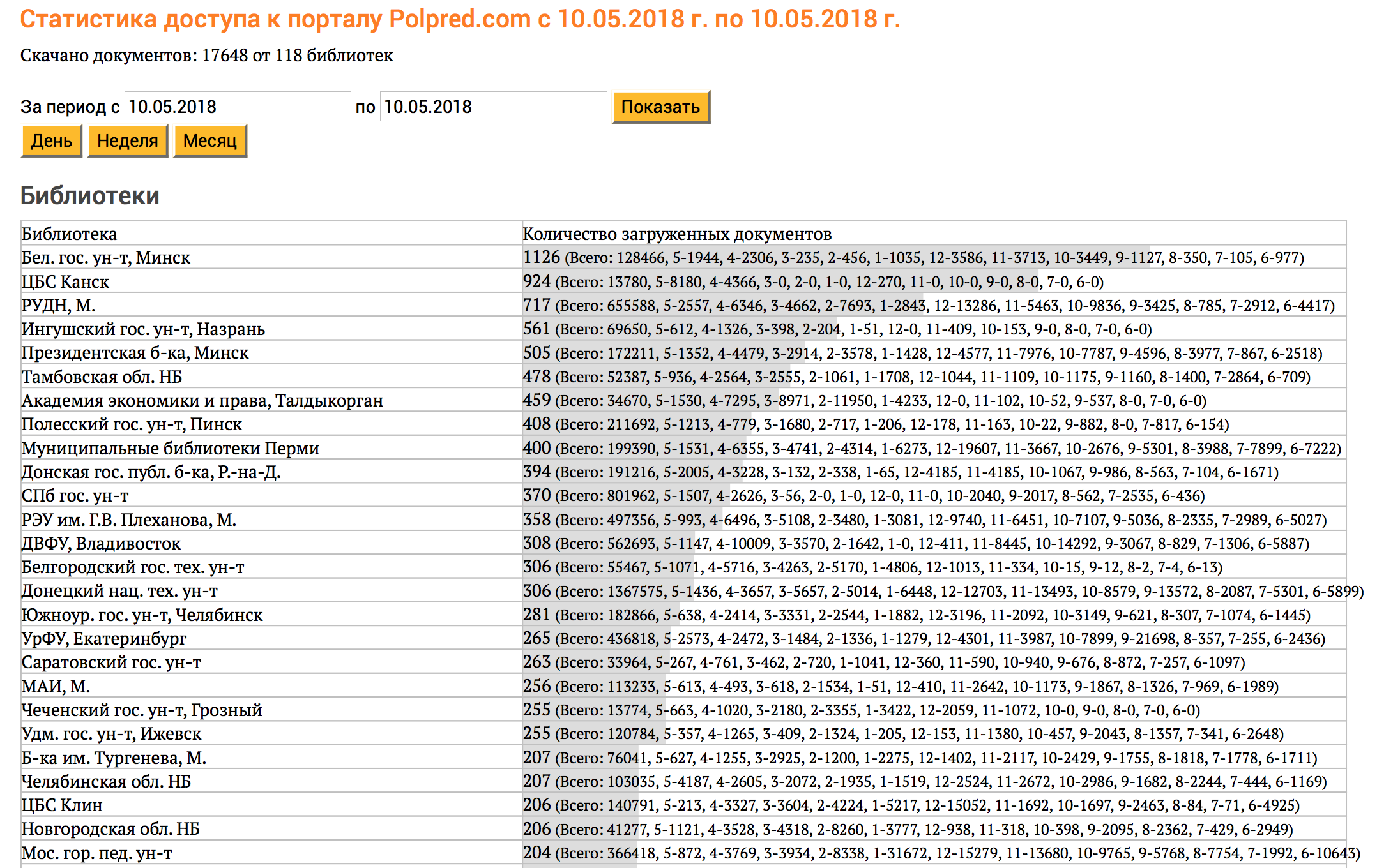 На кнопке с таким названием в меню polpred.com дана статистика пользователей данного ресурса. Polpred обслуживает на постсоветском пространстве все основные вузовские и публичные библиотеки.